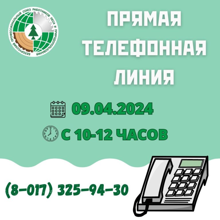 Белорусский профсоюз работников леса и природопользования 9 апреля (вторник) с 10 до 12 часов проведёт «прямую телефонную линию» по вопросам соблюдения законодательства о труде и охране труда, оплаты труда, гарантий для молодых специалистов. Телефон прямой линии (8-017) 325-94-30
