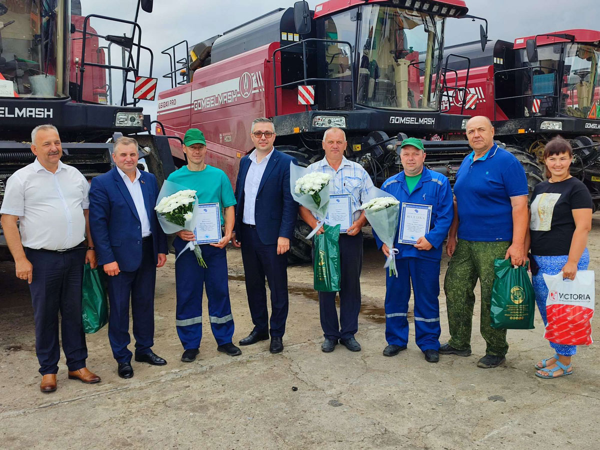 Вадим Грачев вручил Благодарности от имени ФПБ Геннадию Царюку, Василию Пешке и Виктору Васильчику. Александр Солоневич отметил еще троих специалистов хозяйства, которые также вносят значимый вклад в получение и сохранность урожая нынешнего года.