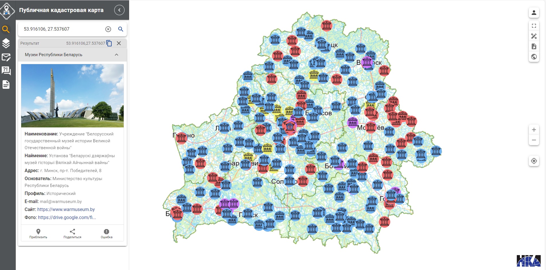 Информационный слой «Музеи Республики Беларусь» на публичной кадастровой карте дополнен геопространственной информацией на основании официальных данных Государственного реестра музеев Республики Беларусь. В результате слой значительно расширен и сегодня содержит сведения о 319 музеях страны.