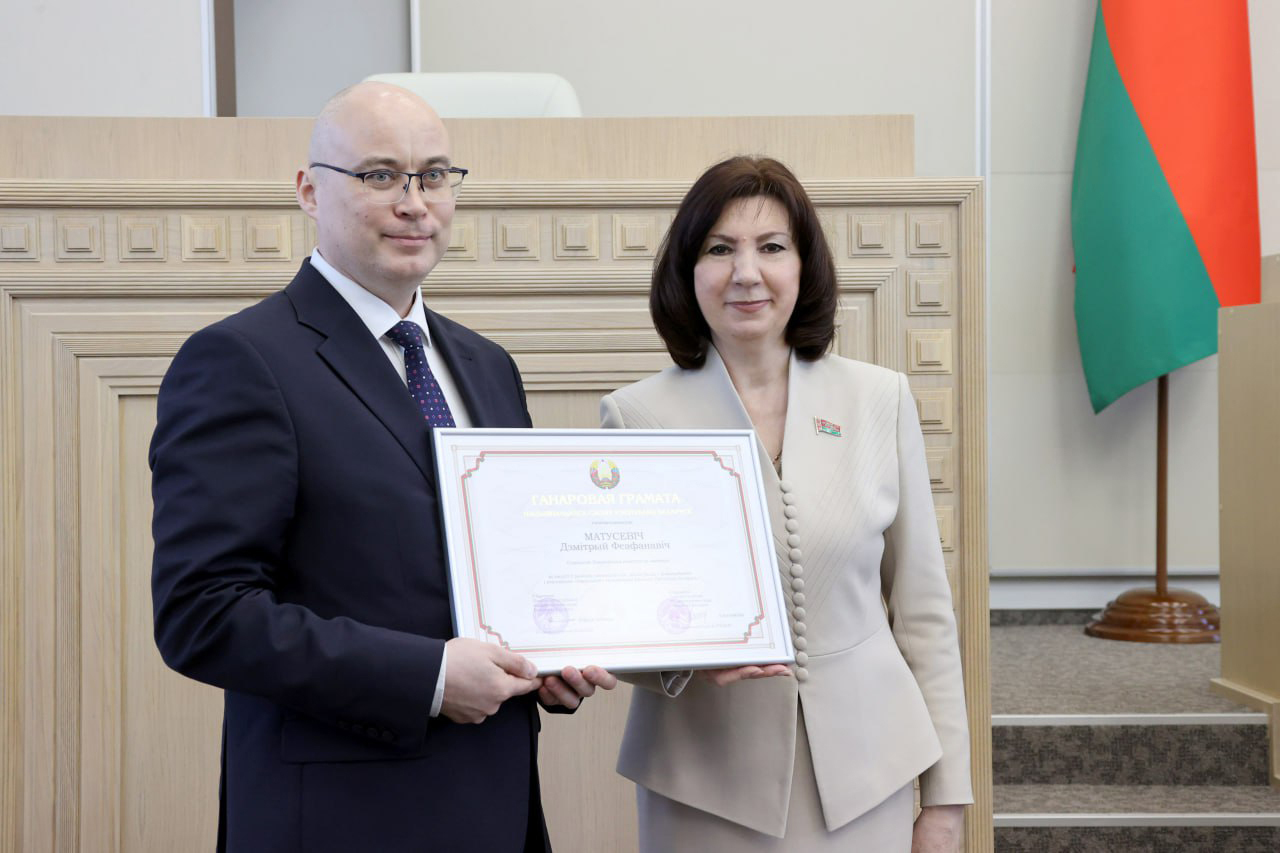 Председатель Госкомимущества Дмитрий Матусевич удостоен Почетной грамоты Национального собрания Республики Беларусь за заслуги в развитии законодательства, большой вклад в формирование и реализацию социальной и экономической политики Республики Беларусь.
