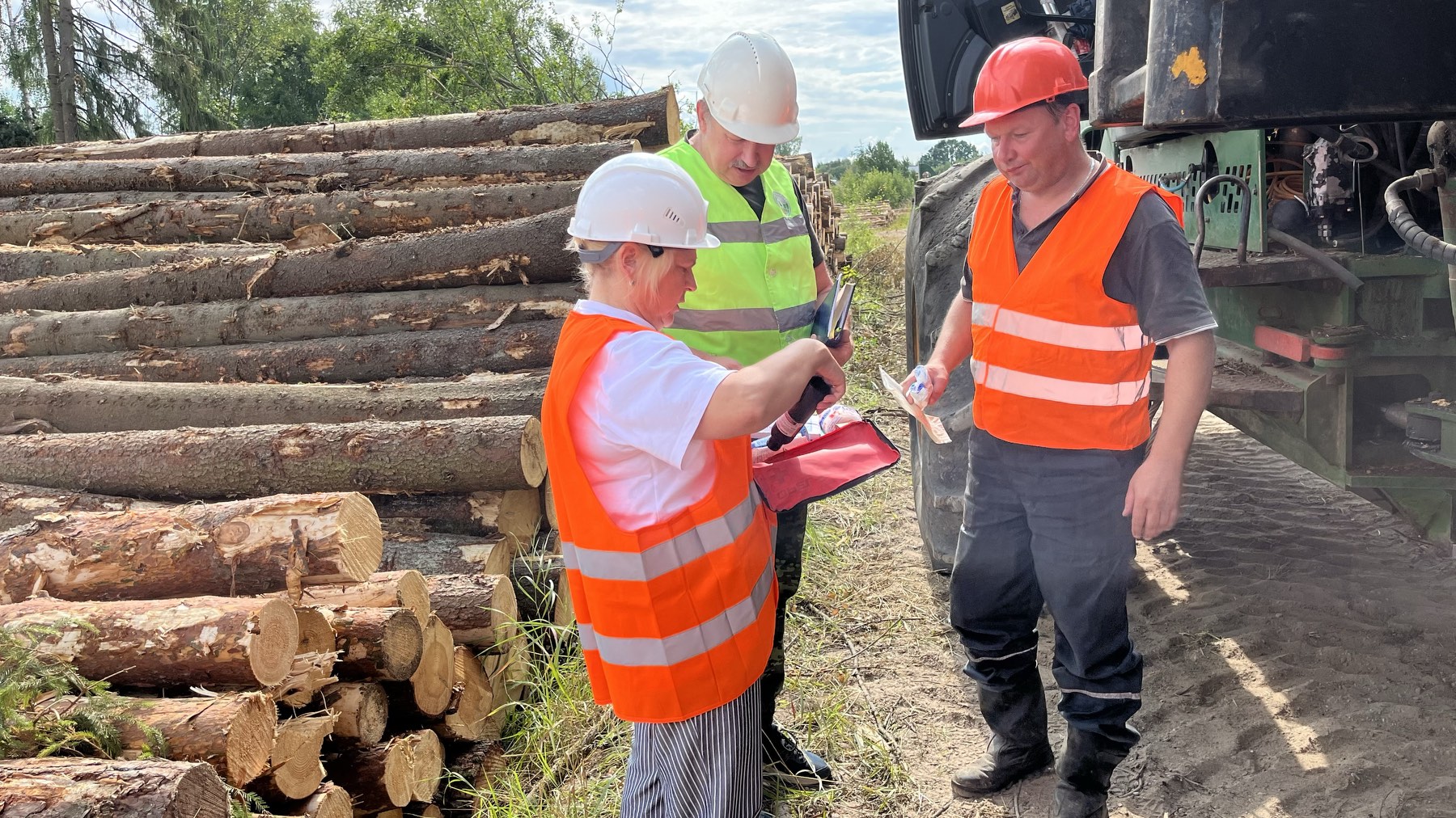 В центре внимания специалистов по охране труда было обеспечение безопасных условий труда операторов харвестеров при разработке ветровально-буреломных лесосек. Профсоюзный инспектор труда обратил внимание на обеспечение питьевого режима, наличие и состав медицинских аптечек, обеспечение работников спецодеждой и обувью, а также соблюдение температурного режима.