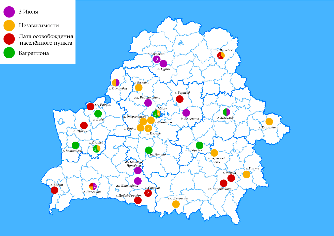 Всего в реестре улиц и дорог значится 40 таких наименований в 30 населенных пунктах. В названиях 12 раз упоминается 3 июля, 16 раз –Независимости, а в честь отдельных дат освобождения населенных пунктов присвоено 12 названий. Кроме того, 10 наименований улиц в 7 населенных пунктах нашей страны носят название операции «Багратион».