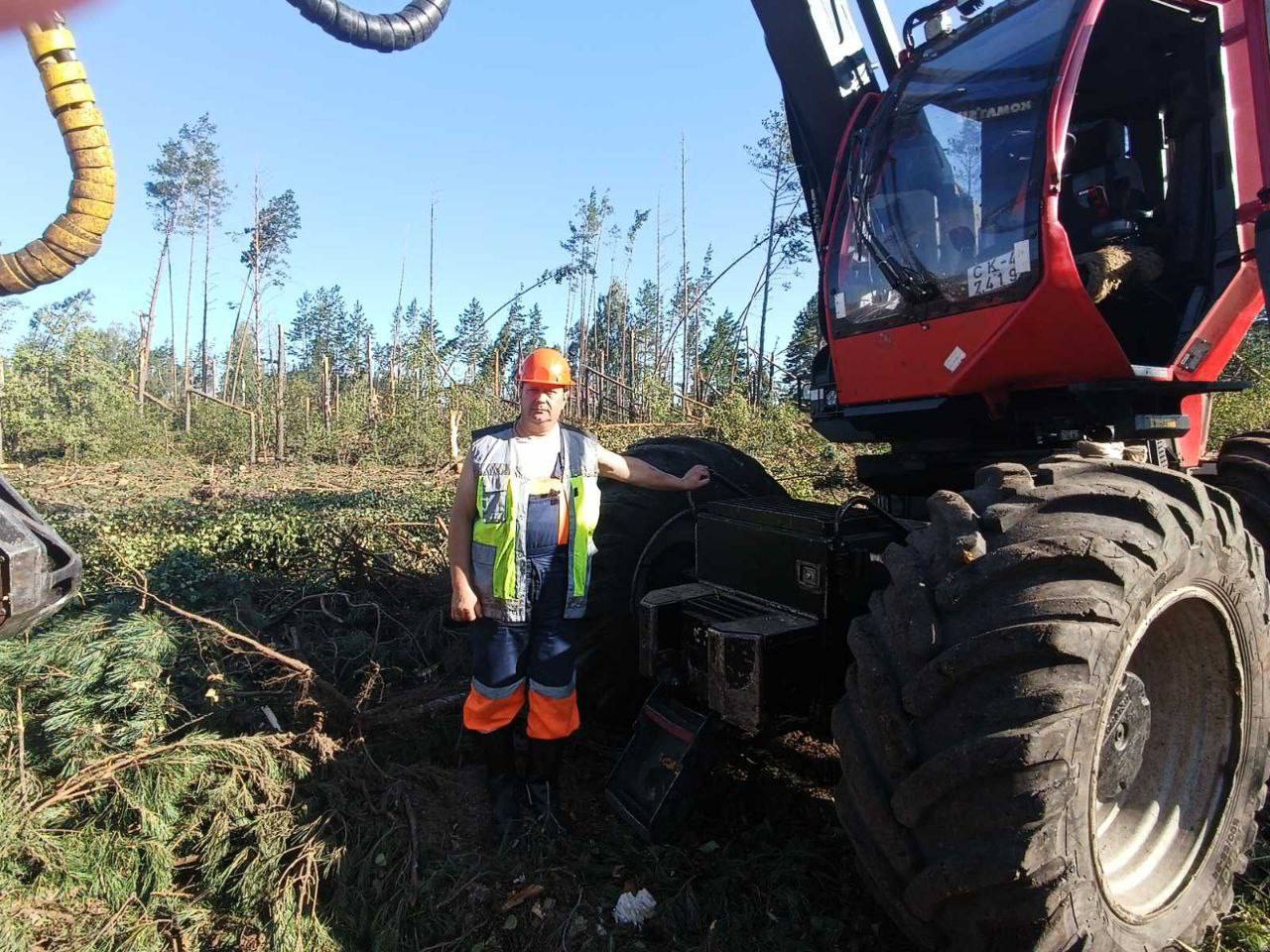 Первым на разбор буреломов и ветровалов в Гомельскую область прибыл машинист (трелевочной) лесозаготовительной машины Komatsu 911 Виктор Плоский. Виктор Иванович работает на данной машине с 2020 года, а общий стаж В Сморгонском опытном лесхозе уже более 10 лет.