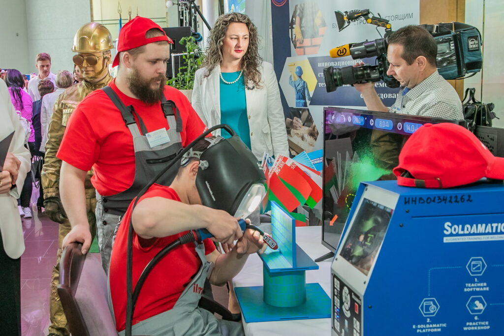 Проникнуться духом праздника помогала развернувшаяся в фойе интерактивная выставка профессий, которую подготовили профсоюзы. Например, у стенда «БЕЛПРОФМАШ» можно было понаблюдать за работой швей. Площадка Белхимпрофсоюза напоминала мини-лабораторию, а представители профсоюза работников образования и науки проводили мастер-класс по созданию бутоньерок «Цветок Великой Победы».