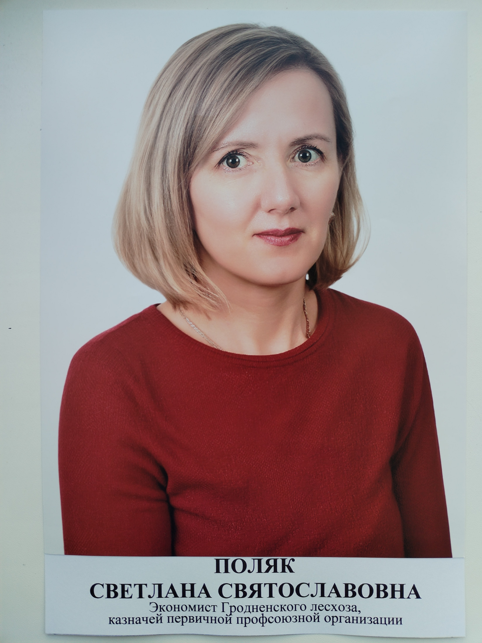 Светлана Святославовна работает экономистом и более 15 лет исполняет общественные обязанности казначея первичной профсоюзной организации «Гродненского лесхоза». Совместно с профсоюзным комитетом направляет свою деятельность на защиту законных прав и интересов членов профсоюза. Считает важным заложить основу для создания слаженного и сплоченного трудового коллектива. Поляк Светлана обладает большим опытом работы и практическими знаниями, коммуникабельна, трудолюбива, вежлива, тактична, способна находить индивидуальный подход к каждому члену коллектива. Светлана Поляк принимает активное участие в общественной и культурно-массовой жизни коллектива.
