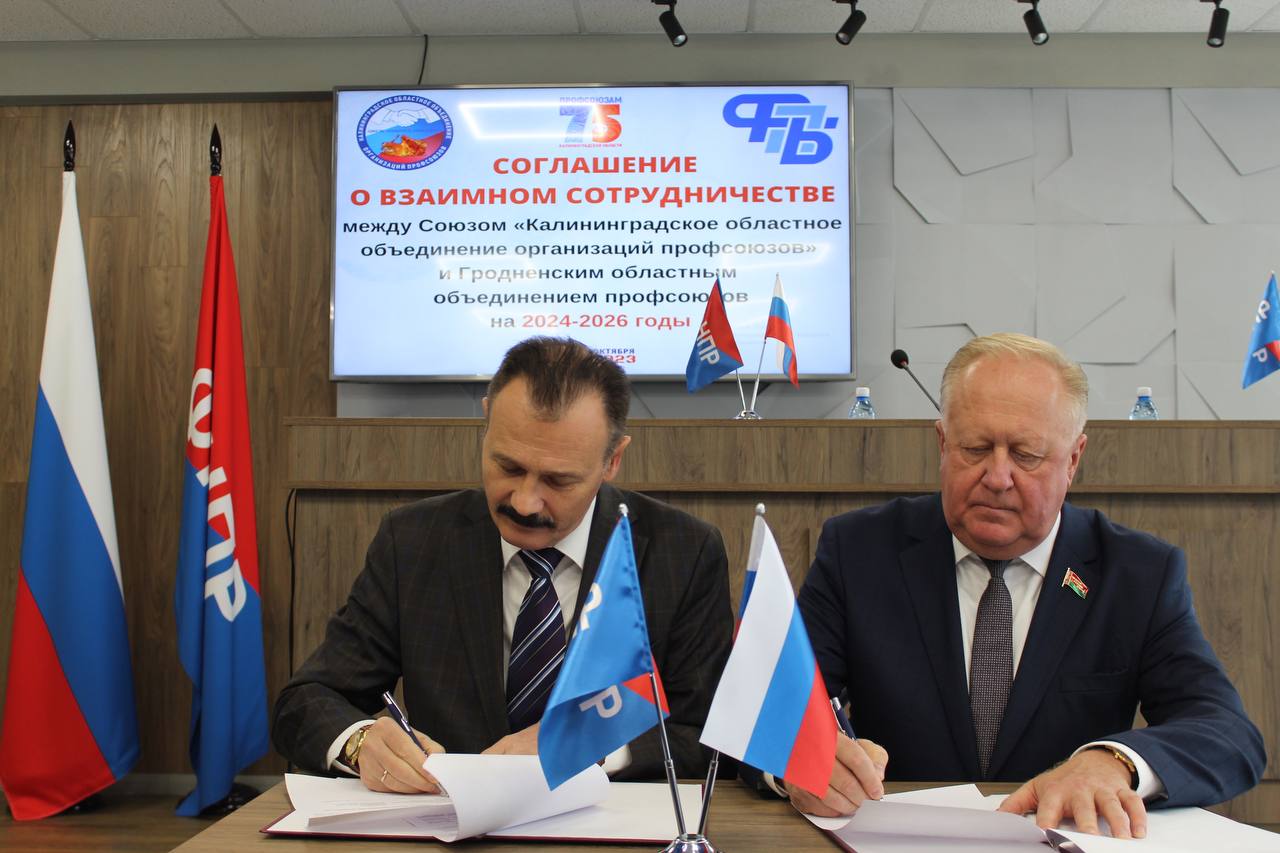 Председатель Гродненского областного объединения профсоюзов, член Совета Республики Национального собрания Республики Беларусь Виктор Лискович и председатель Союза «Калининградское областное объединение организаций профсоюзов» Виктор Захарчиц скрепили договор подписями.