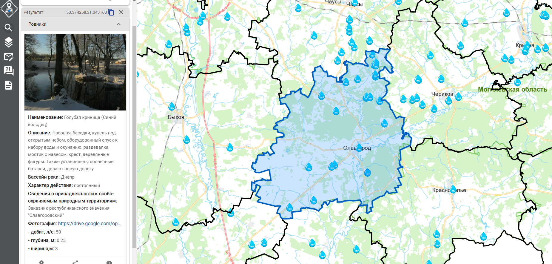 На текущий момент слой на карте создан и обновляется на всю Беларусь и содержит геопривязанную информацию о 1 253 родниках, имеющих историческое, географическое, природное, экологическое, духовное и другое значение для жителей и гостей нашей страны.
