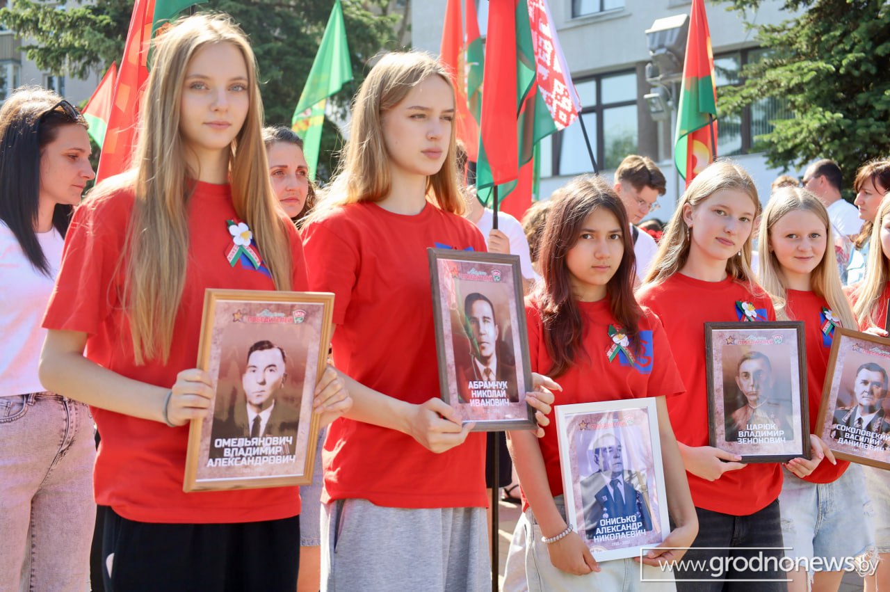 В колонну встали жители разных уголков Беларуси, которые собрались воедино, чтобы в очередной раз напомнить всем, что подвиг героев советского народа никогда не будет забыт. Многие из них держали перед собой портреты своих родных, судьбы которых опалила Великая Отечественная война.
