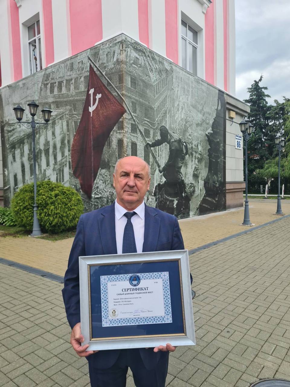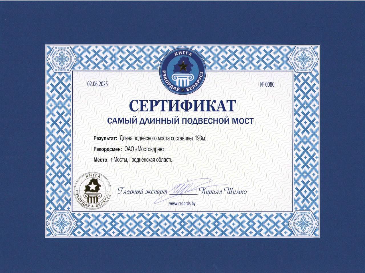 Сертификат "Самый длинный подвесной мост" получил гендиректор предприятия "Мостовдрев" (город Мосты) Сергей Ососов.