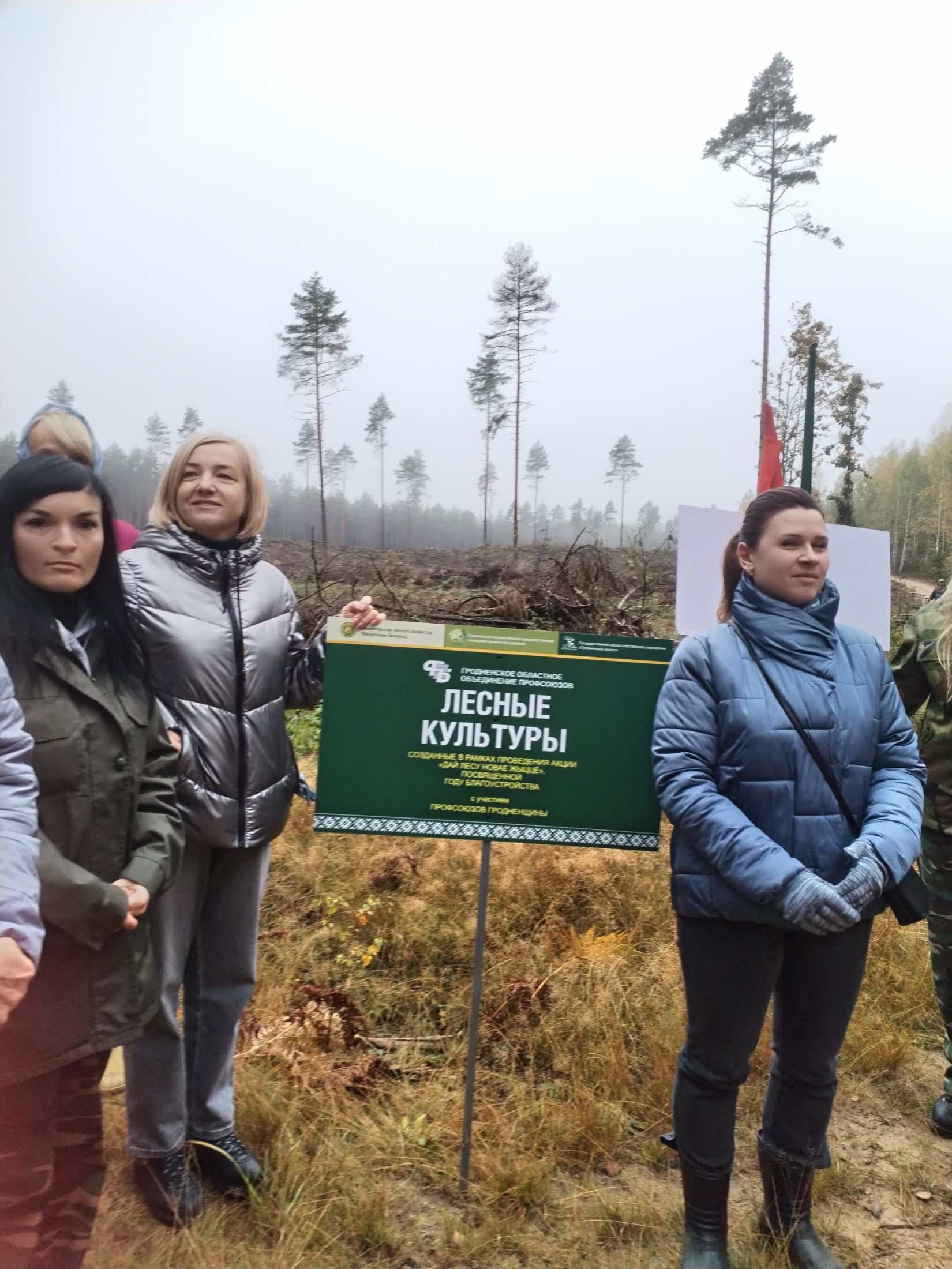 Председатель Гродненской областной организации Профсоюза леса и природопользования Елена Квартник, штатные работники приняли участие в посадке саженцев сосны.