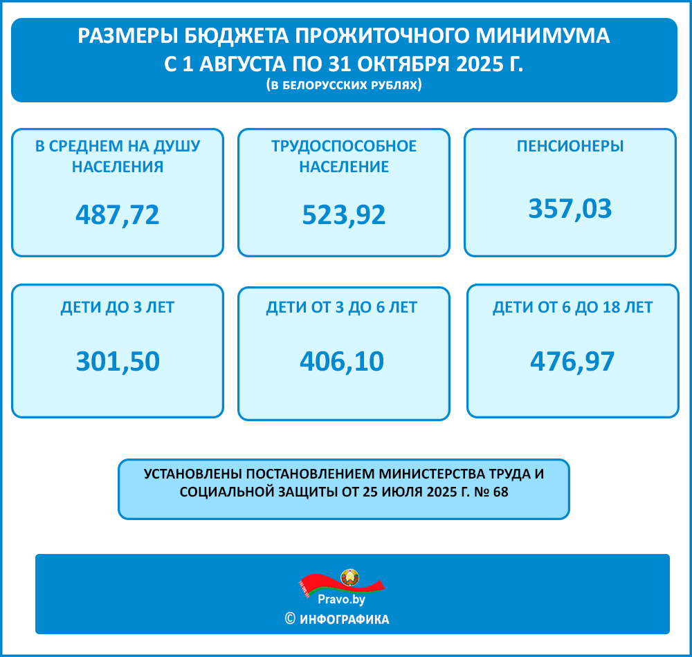 Постановлением Министерства труда и социальной защиты от 25 июля 2025 г. № 68 установлены новые размеры бюджета прожиточного минимума (БПМ) в среднем на душу населения и по основным социально-демографическим группам на период с 1 августа по 31 октября 2025 г.