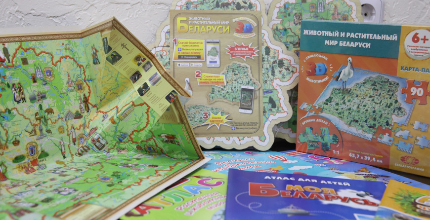 Занимательные карты и атласы очень интересны для детей. Например, карта «Животный и растительный мир Беларуси» с 3D-эффектом. Для полноты картинки надо скачать бесплатное приложение «Белкартография» (для Android и IOS), навести на карту камеру телефона и «оживить» животных. Есть такая карта и в виде деревянных пазлов. Яркая, красочная карта «Мая Радзiма – Беларусь» познакомит детей с природными и культурными достопримечательностями нашей страны.