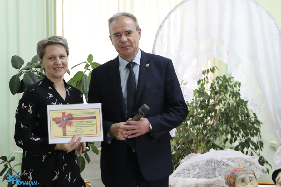 По решению президиума областной профсоюзной организации учреждению была оказана спонсорская помощь на укрепление материально-технической базы. Александр Петрович вручил сертификат и сказал добрые слова в адрес жителей и работников пансионата: