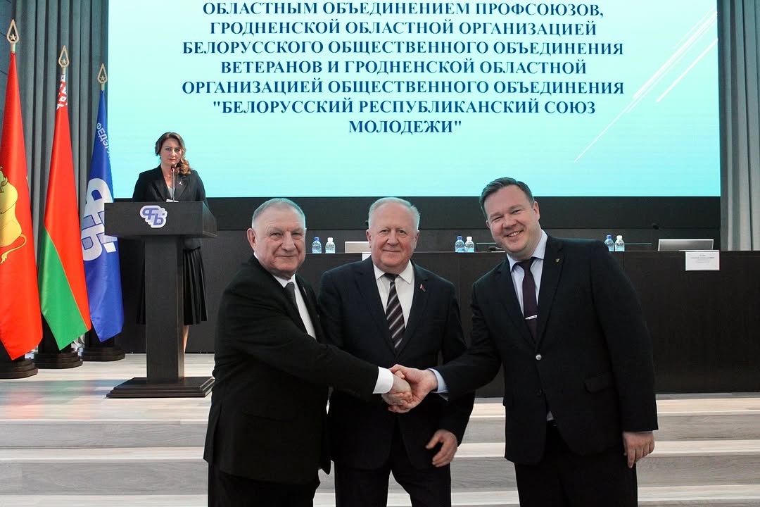 Соглашение о сотрудничестве со стороны Гродненского областного объединения профсоюзов подписал председатель Виктор Лискович, Гродненского областного Совета Белорусского общественного объединения ветеранов председатель Иван Тустов, Гродненского областного комитета общественного объединения «Белорусский республиканский союз молодежи» первый секретарь Андрей Есин.