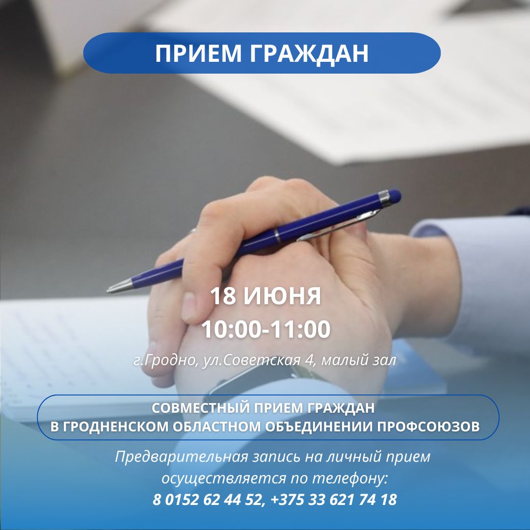 18 июня 2025 года с 10:00 до 11:00 в малом зале заседаний (3 этаж) Гродненского областного объединения профсоюзов (г. Гродно, ул. Советская, 4) состоится совместный прием граждан.