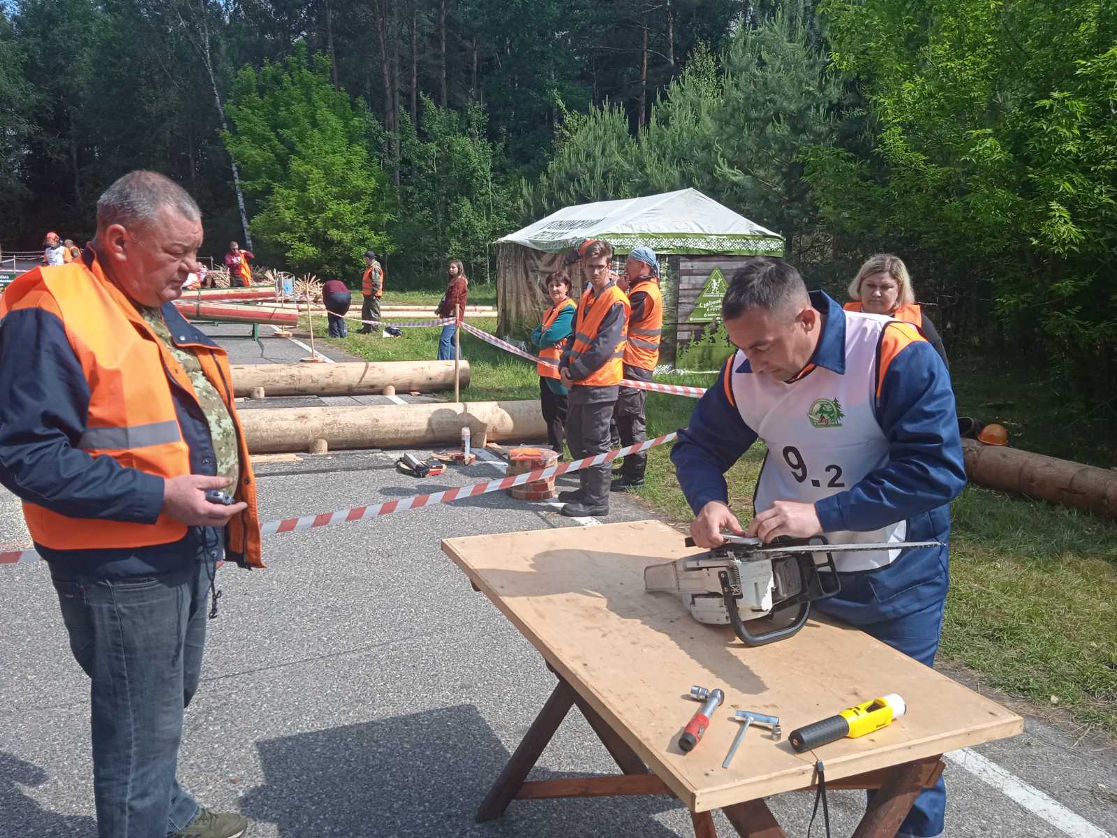 В программе соревнований пять основных дисциплин. "Первая дисциплина - это монтаж новой цепи, где оценивается скорость и качество установки. Лучшие результаты наших профессионалов достигают 8-10 секунд. Вторая дисциплина - это точная раскряжевка, потом - раскряжевка комбинированным резом и обрезка сучьев. Основная дисциплина - это валка деревьев, которая происходит в лесу. Отбираются специальные деревья, нумеруются, и по жребию каждому вальщику леса достается определенное дерево, которое он должен будет свалить, соблюдая все требования по охране труда, и максимально точно, - сказал ведущий инженер по охране труда Гродненского ГПЛХО.