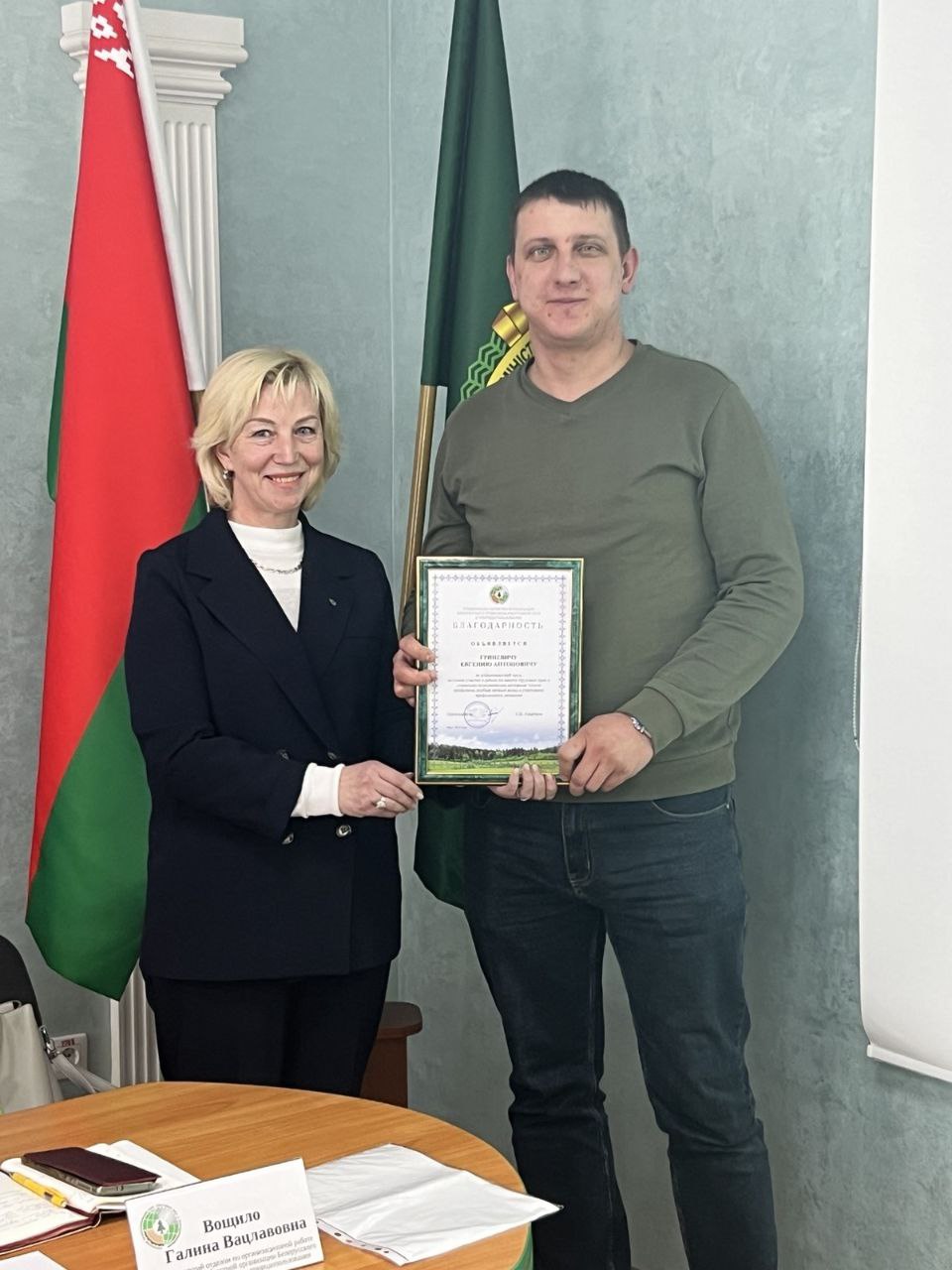 Галина Вощило, заведующий отделом организационной работы областной организации отраслевого Профсоюза, вручила благодарность заместителю директора Евгению Гриневичу.