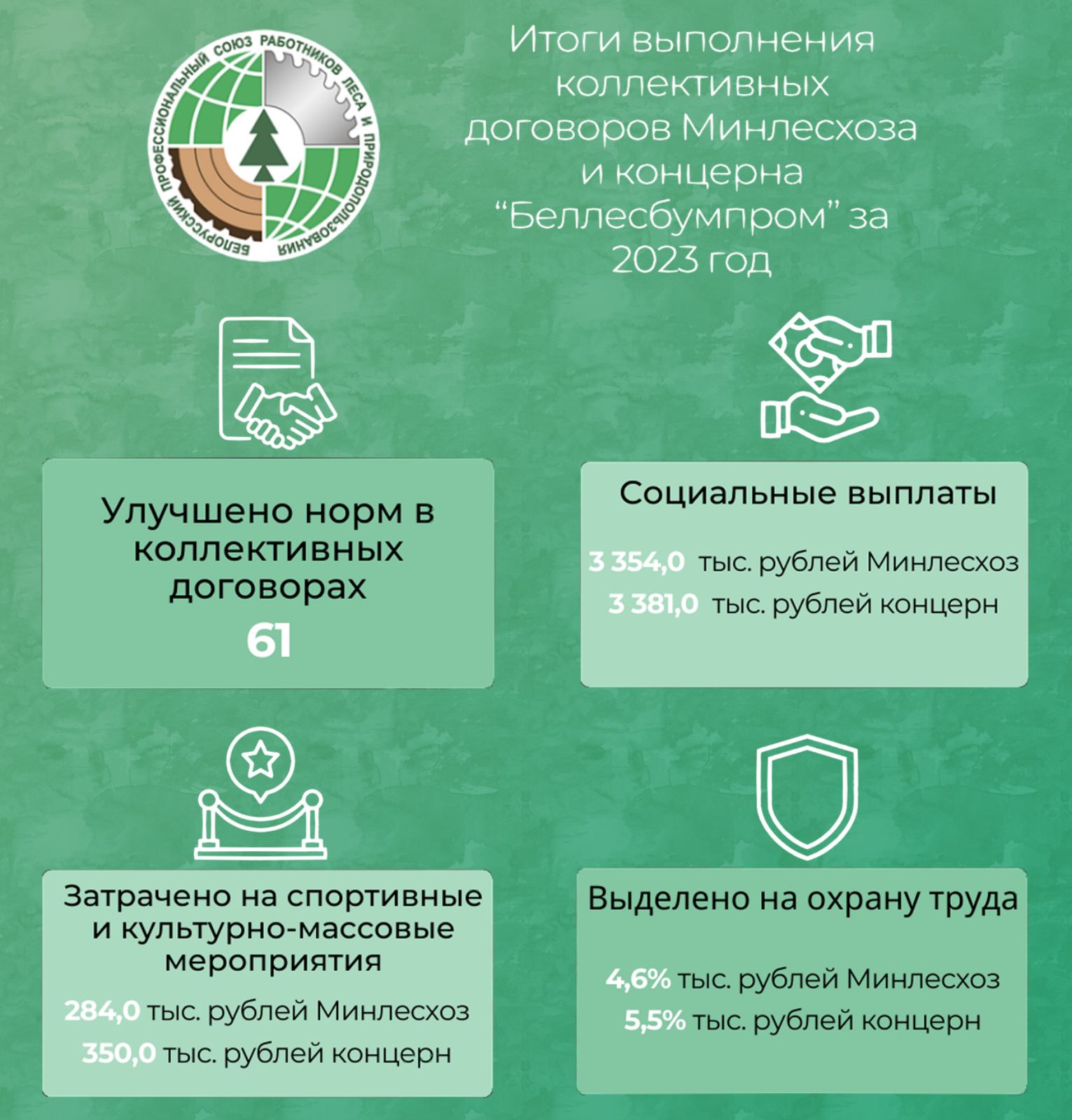 Подводя итоги выполнения коллективных договоров были названы суммы социальных выплаты в соответствии с коллективными договорами в 2023 году: по организациям Минлесхоза – 3 354,00 тыс. рублей (в среднем 855,0 руб. на одного человека), по организациям Концерна – 3 381,00 тыс. руб. (в среднем 1245,0 руб. на одного человека).