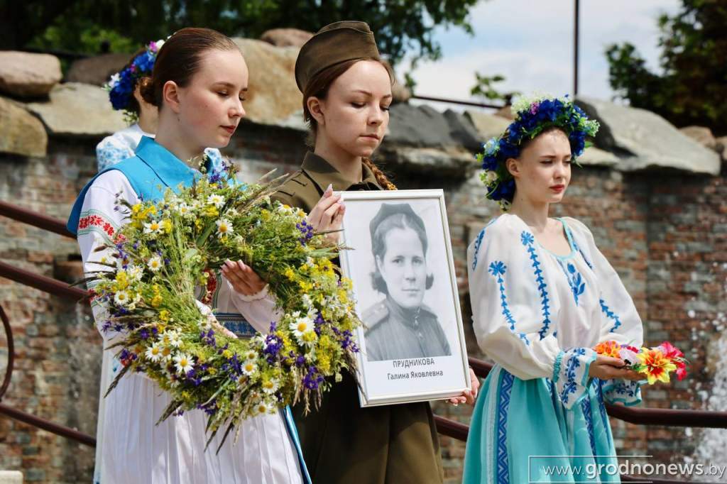 Каждый район Гродненщины отдал дань памяти конкретной женщине-ветерану, сплетя в их честь венок. От Прудниковой Галины Яковлевны, которая служила в Главном управлении связи, командовала взводом связистов, до Клочковой Марии Григорьевны, которую в июле 1942 года в 16-летнем возрасте угнали на работы в оккупированную Литву, после освобождения в 44-м она прошла курс санитарок и была зачислена в санитарный батальон полевого госпиталя. За каждым венком – история мужества, боли и победы.