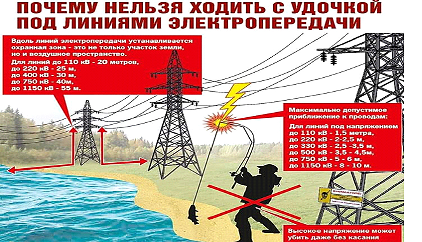 Чаще всего рыбаками используются телескопические удочки, длина которых может быть более шести метров. Примерно такое расстояние от проводов до поверхности земли. Если удилище или леска приближаются на недопустимо близкое расстояние к проводам или прикасаются к ним, под воздействием электрического тока оказывается не только человек, который держит удочку, но и люди, которые находятся рядом. Кроме того, опасным может быть токопроводящий материал, из которого сделана удочка. А влажность и близость воды могут усилить воздействие электрического тока на человека.