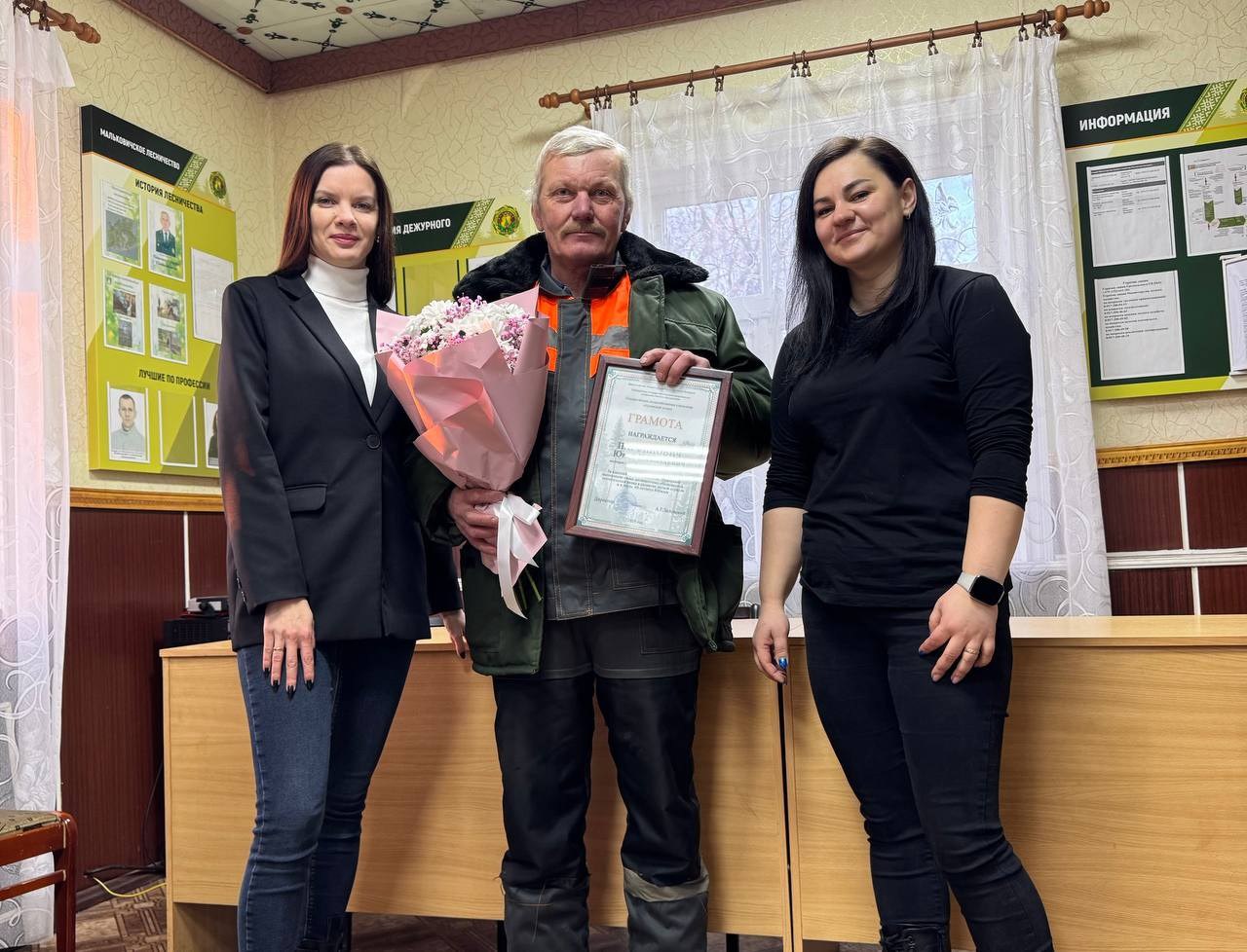 Профсоюзный комитет и администрация Щучинского лесхоза с юбилеем поздравили Юрия Николаевича Парфиновича, вальщика леса Мальковичского лесничества.