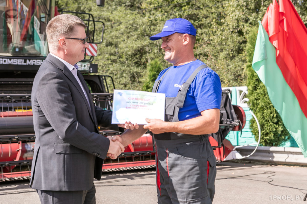Лидер национального профцентра вручил лучшим работникам хозяйства, проявившим себя во время уборочной, денежные сертификаты.
